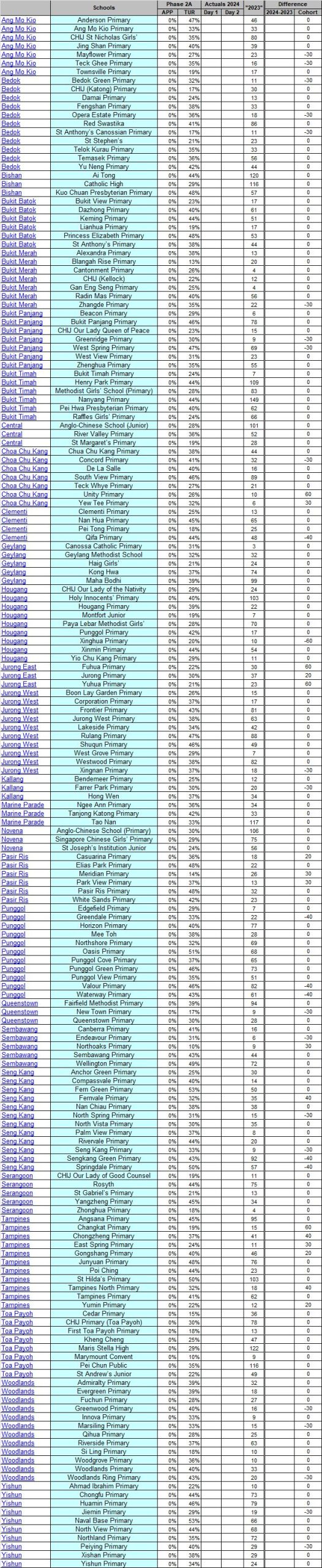 We have also included a “2023” column to reflect the take-up rate of last year’s Phase 2A registration. In the last column of this table is the “Cohort” column, which shows the overall difference between the total number of vacancies offered this year compared to last year’s. As you can see, many schools have lost 30 places (1 class).